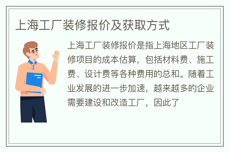 上海工厂装修报价是指上海地区工厂装修项目的成本估算,包括材料费、施工费、设计费等各种费用的总和。随着工业发展的进一步加速,越来越多的企业需要建设和改造工厂,因此了......【点击详情】