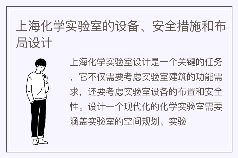 上海化学实验室设计是一个关键的任务,它不仅需要考虑实验室建筑的功能需求,还要考虑实验室设备的布置和安全性。设计一个现代化的化学实验室需要涵盖实验室的空间规划、实验......【点击详情】