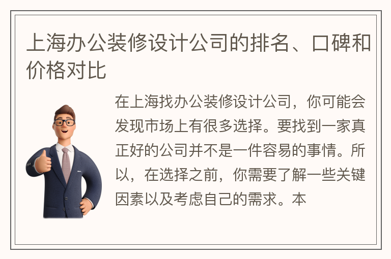 在上海找办公装修设计公司,你可能会发现市场上有很多选择。要找到一家真正好的公司并不是一件容易的事情。所以,在选择之前,你需要了解一些关键因素以及考虑自己的需求。本......【点击详情】