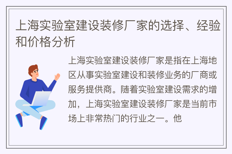 上海实验室建设装修厂家是指在上海地区从事实验室建设和装修业务的厂商或服务提供商。随着实验室建设需求的增加,上海实验室建设装修厂家是当前市场上非常热门的行业之一。他......【点击详情】