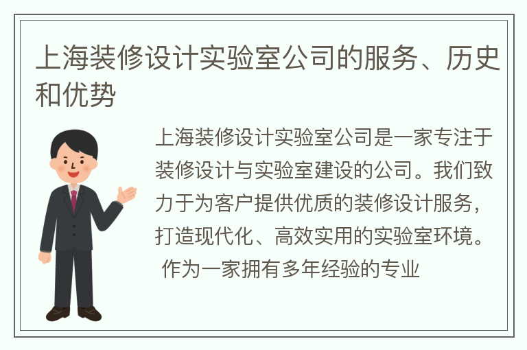 上海装修设计实验室公司是一家专注于装修设计与实验室建设的公司。我们致力于为客户提供优质的装修设计服务,打造现代化、高效实用的实验室环境。 作为一家拥有多年经验的专业......【点击详情】