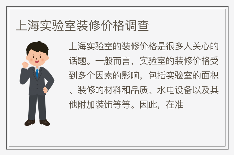 上海实验室的装修价格是很多人关心的话题。一般而言,实验室的装修价格受到多个因素的影响,包括实验室的面积、装修的材料和品质、水电设备以及其他附加装饰等等。因此,在准......【点击详情】