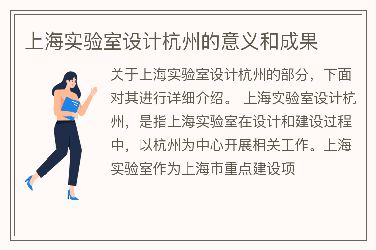 关于上海实验室设计杭州的部分,下面对其进行详细介绍。 上海实验室设计杭州,是指上海实验室在设计和建设过程中,以杭州为中心开展相关工作。上海实验室作为上海市重点建设项......【点击详情】
