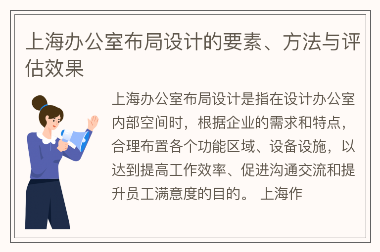上海办公室布局设计是指在设计办公室内部空间时,根据企业的需求和特点,合理布置各个功能区域、设备设施,以达到提高工作效率、促进沟通交流和提升员工满意度的目的。 上海作......【点击详情】