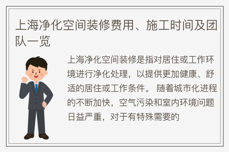 上海净化空间装修是指对居住或工作环境进行净化处理,以提供更加健康、舒适的居住或工作条件。 随着城市化进程的不断加快,空气污染和室内环境问题日益严重,对于有特殊需要的......【点击详情】