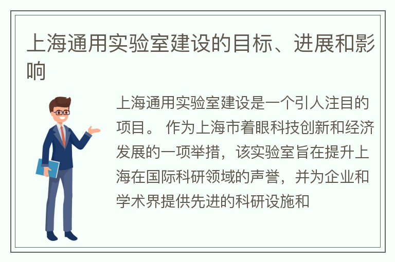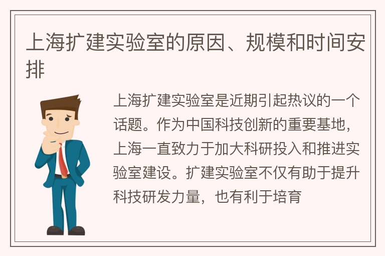 上海扩建实验室是近期引起热议的一个话题。作为中国科技创新的重要基地,上海一直致力于加大科研投入和推进实验室建设。扩建实验室不仅有助于提升科技研发力量,也有利于培育......【点击详情】