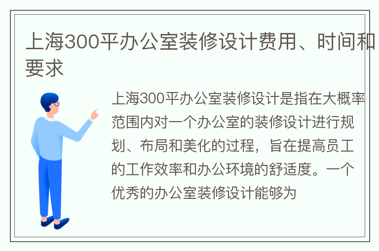 上海300平办公室装修设计是指在大概率范围内对一个办公室的装修设计进行规划、布局和美化的过程,旨在提高员工的工作效率和办公环境的舒适度。一个优秀的办公室装修设计能够为......【点击详情】