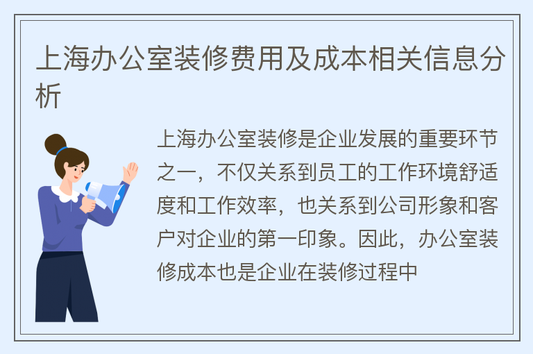 上海办公室装修是企业发展的重要环节之一,不仅关系到员工的工作环境舒适度和工作效率,也关系到公司形象和客户对企业的第一印象。因此,办公室装修成本也是企业在装修过程中......【点击详情】
