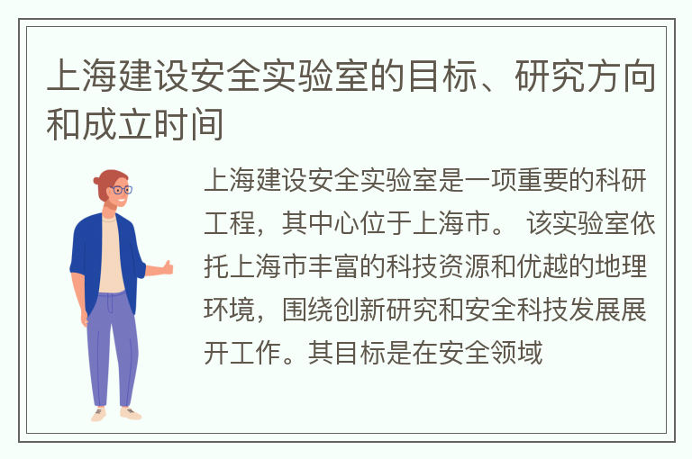 上海建设安全实验室是一项重要的科研工程,其中心位于上海市。 该实验室依托上海市丰富的科技资源和优越的地理环境,围绕创新研究和安全科技发展展开工作。其目标是在安全领域......【点击详情】