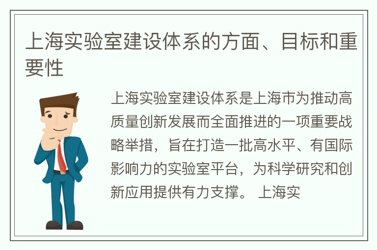 上海实验室建设体系是上海市为推动高质量创新发展而全面推进的一项重要战略举措,旨在打造一批高水平、有国际影响力的实验室平台,为科学研究和创新应用提供有力支撑。 上海实......【点击详情】