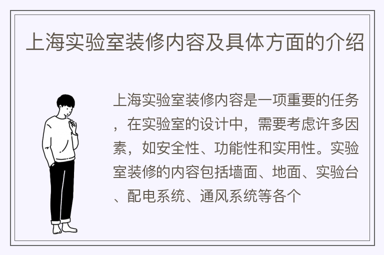 上海实验室装修内容是一项重要的任务,在实验室的设计中,需要考虑许多因素,如安全性、功能性和实用性。实验室装修的内容包括墙面、地面、实验台、配电系统、通风系统等各个......【点击详情】
