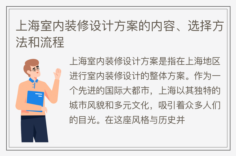 上海室内装修设计方案是指在上海地区进行室内装修设计的整体方案。作为一个先进的国际大都市,上海以其独特的城市风貌和多元文化,吸引着众多人们的目光。在这座风格与历史并......【点击详情】
