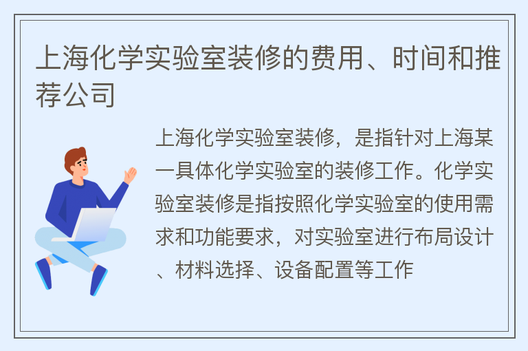 上海化学实验室装修,是指针对上海某一具体化学实验室的装修工作。化学实验室装修是指按照化学实验室的使用需求和功能要求,对实验室进行布局设计、材料选择、设备配置等工作......【点击详情】