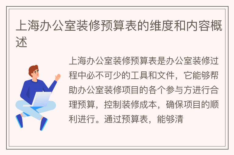 上海办公室装修预算表是办公室装修过程中必不可少的工具和文件,它能够帮助办公室装修项目的各个参与方进行合理预算,控制装修成本,确保项目的顺利进行。通过预算表,能够清......【点击详情】