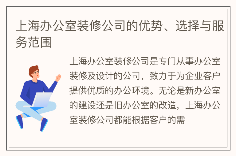 上海办公室装修公司是专门从事办公室装修及设计的公司,致力于为企业客户提供优质的办公环境。无论是新办公室的建设还是旧办公室的改造,上海办公室装修公司都能根据客户的需......【点击详情】