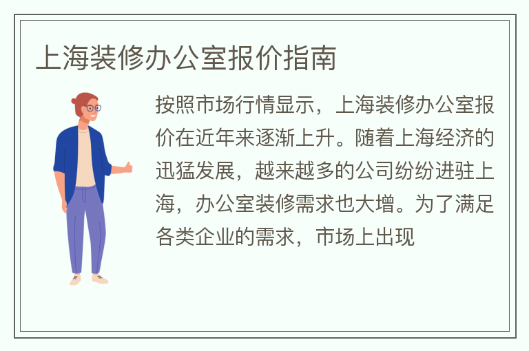 按照市场行情显示,上海装修办公室报价在近年来逐渐上升。随着上海经济的迅猛发展,越来越多的公司纷纷进驻上海,办公室装修需求也大增。为了满足各类企业的需求,市场上出现......【点击详情】