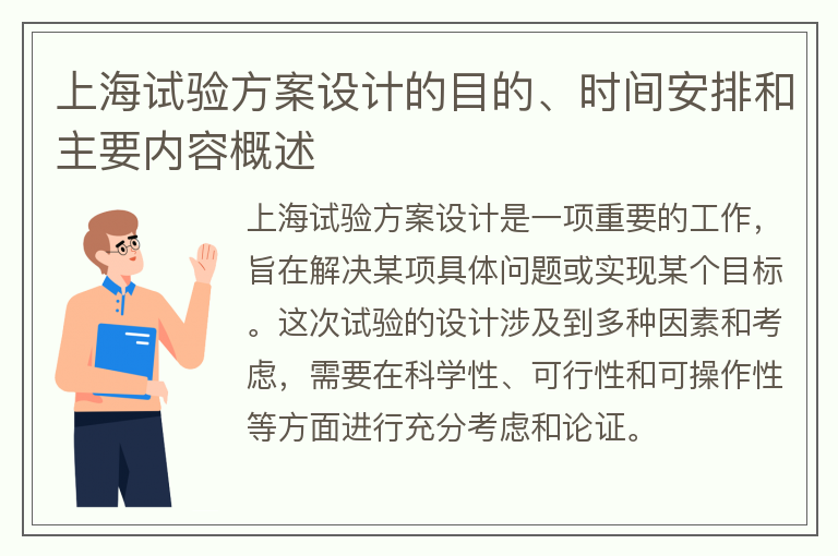 上海试验方案设计是一项重要的工作,旨在解决某项具体问题或实现某个目标。这次试验的设计涉及到多种因素和考虑,需要在科学性、可行性和可操作性等方面进行充分考虑和论证。......【点击详情】