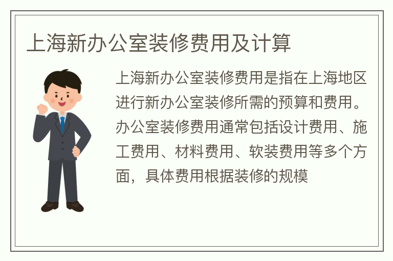 上海新办公室装修费用是指在上海地区进行新办公室装修所需的预算和费用。办公室装修费用通常包括设计费用、施工费用、材料费用、软装费用等多个方面,具体费用根据装修的规模......【点击详情】