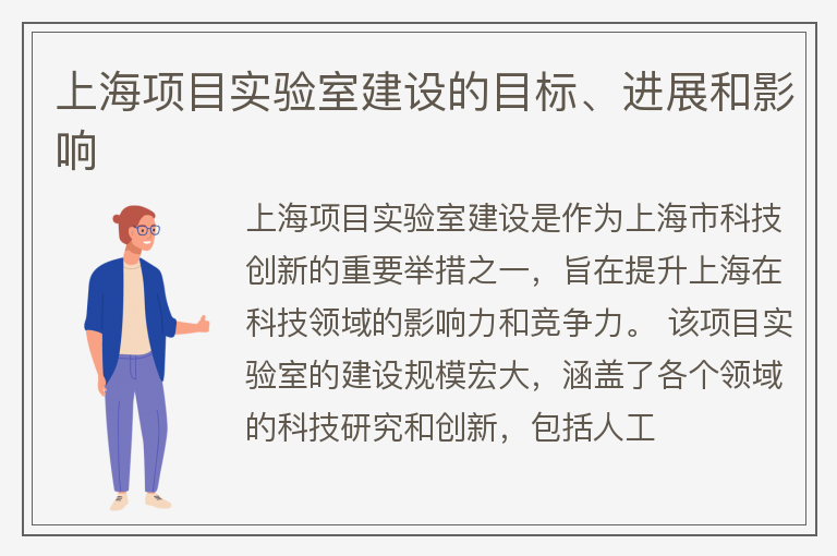 上海项目实验室建设是作为上海市科技创新的重要举措之一,旨在提升上海在科技领域的影响力和竞争力。 该项目实验室的建设规模宏大,涵盖了各个领域的科技研究和创新,包括人工......【点击详情】