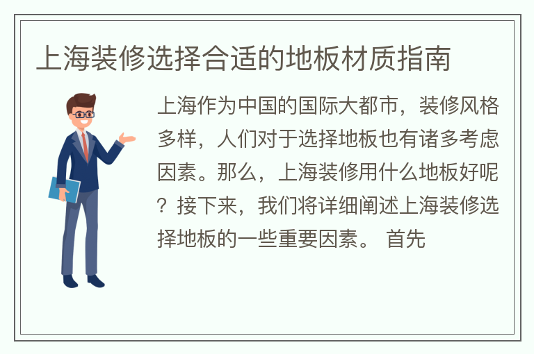 上海作为中国的国际大都市,装修风格多样,人们对于选择地板也有诸多考虑因素。那么,上海装修用什么地板好呢?接下来,我们将详细阐述上海装修选择地板的一些重要因素。 首先......【点击详情】