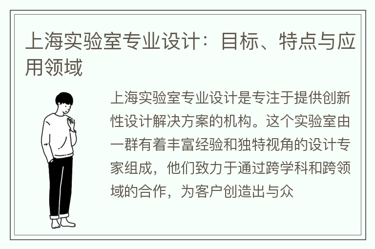 上海实验室专业设计是专注于提供创新性设计解决方案的机构。这个实验室由一群有着丰富经验和独特视角的设计专家组成,他们致力于通过跨学科和跨领域的合作,为客户创造出与众......【点击详情】