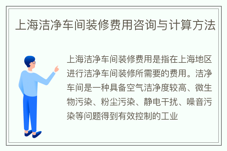 上海洁净车间装修费用是指在上海地区进行洁净车间装修所需要的费用。洁净车间是一种具备空气洁净度较高、微生物污染、粉尘污染、静电干扰、噪音污染等问题得到有效控制的工业......【点击详情】