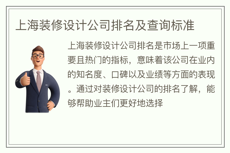 上海装修设计公司排名是市场上一项重要且热门的指标,意味着该公司在业内的知名度、口碑以及业绩等方面的表现。通过对装修设计公司的排名了解,能够帮助业主们更好地选择......【点击详情】