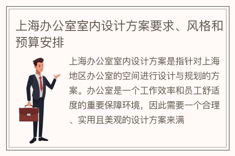 上海办公室室内设计方案是指针对上海地区办公室的空间进行设计与规划的方案。办公室是一个工作效率和员工舒适度的重要保障环境,因此需要一个合理、实用且美观的设计方案来满......【点击详情】