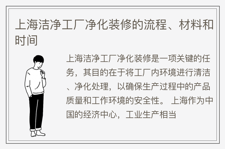 上海洁净工厂净化装修是一项关键的任务,其目的在于将工厂内环境进行清洁、净化处理,以确保生产过程中的产品质量和工作环境的安全性。 上海作为中国的经济中心,工业生产相当......【点击详情】