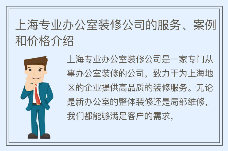 上海专业办公室装修公司是一家专门从事办公室装修的公司,致力于为上海地区的企业提供高品质的装修服务。无论是新办公室的整体装修还是局部维修,我们都能够满足客户的需求,......【点击详情】