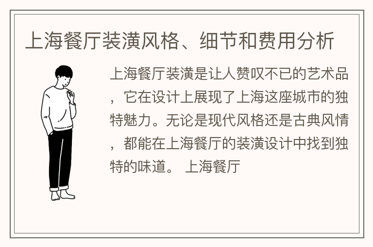 上海餐厅装潢是让人赞叹不已的艺术品,它在设计上展现了上海这座城市的独特魅力。无论是现代风格还是古典风情,都能在上海餐厅的装潢设计中找到独特的味道。 上海餐厅......【点击详情】