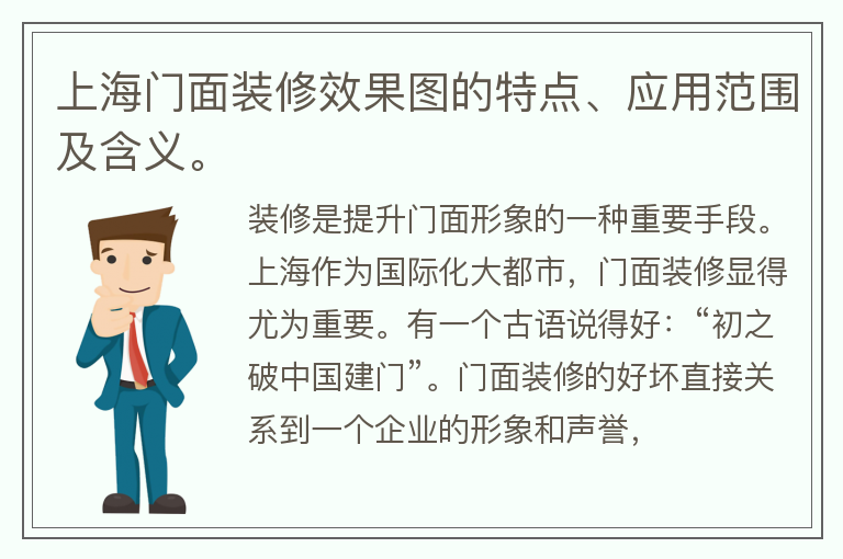 装修是提升门面形象的一种重要手段。上海作为国际化大都市,门面装修显得尤为重要。有一个古语说得好:“初之破中国建门”。门面装修的好坏直接关系到一个企业的形象和声誉,......【点击详情】