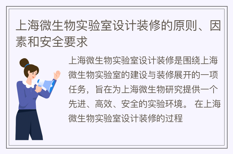 上海微生物实验室设计装修是围绕上海微生物实验室的建设与装修展开的一项任务,旨在为上海微生物研究提供一个先进、高效、安全的实验环境。 在上海微生物实验室设计装修的过程......【点击详情】