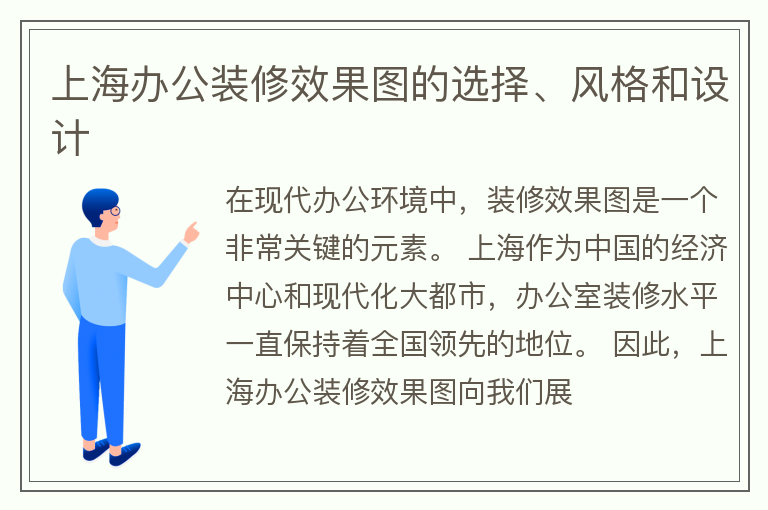 在现代办公环境中,装修效果图是一个非常关键的元素。 上海作为中国的经济中心和现代化大都市,办公室装修水平一直保持着全国领先的地位。 因此,上海办公装修效果图向我们展......【点击详情】