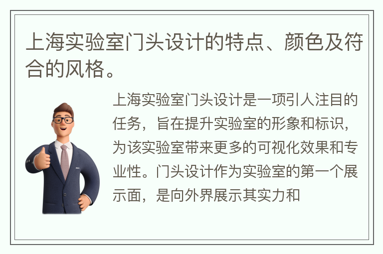 上海实验室门头设计是一项引人注目的任务,旨在提升实验室的形象和标识,为该实验室带来更多的可视化效果和专业性。门头设计作为实验室的第一个展示面,是向外界展示其实力和......【点击详情】