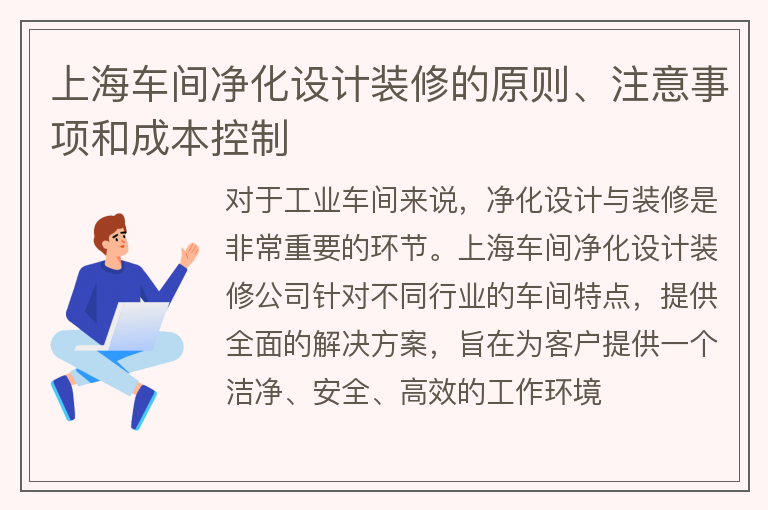 对于工业车间来说,净化设计与装修是非常重要的环节。上海车间净化设计装修公司针对不同行业的车间特点,提供全面的解决方案,旨在为客户提供一个洁净、安全、高效的工作环境......【点击详情】
