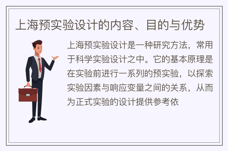 上海预实验设计是一种研究方法,常用于科学实验设计之中。它的基本原理是在实验前进行一系列的预实验,以探索实验因素与响应变量之间的关系,从而为正式实验的设计提供参考依......【点击详情】