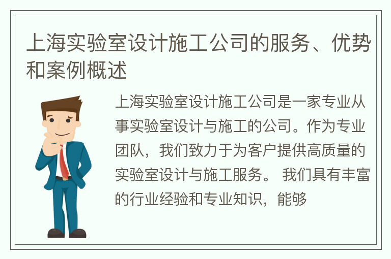上海实验室设计施工公司是一家专业从事实验室设计与施工的公司。作为专业团队,我们致力于为客户提供高质量的实验室设计与施工服务。 我们具有丰富的行业经验和专业知识,能够......【点击详情】