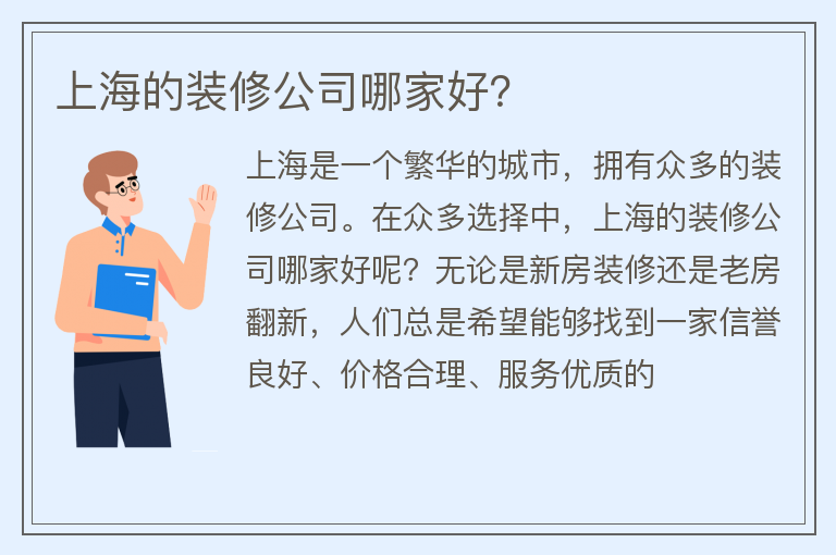 上海是一个繁华的城市,拥有众多的装修公司。在众多选择中,上海的装修公司哪家好呢?无论是新房装修还是老房翻新,人们总是希望能够找到一家信誉良好、价格合理、服务优质的......【点击详情】