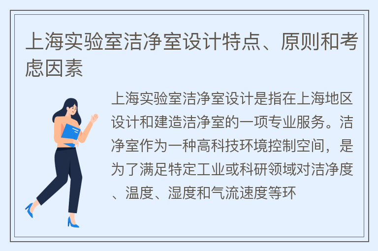 上海实验室洁净室设计是指在上海地区设计和建造洁净室的一项专业服务。洁净室作为一种高科技环境控制空间,是为了满足特定工业或科研领域对洁净度、温度、湿度和气流速度等环......【点击详情】