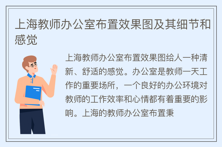 上海教师办公室布置效果图给人一种清新、舒适的感觉。办公室是教师一天工作的重要场所,一个良好的办公环境对教师的工作效率和心情都有着重要的影响。上海的教师办公室布置秉......【点击详情】
