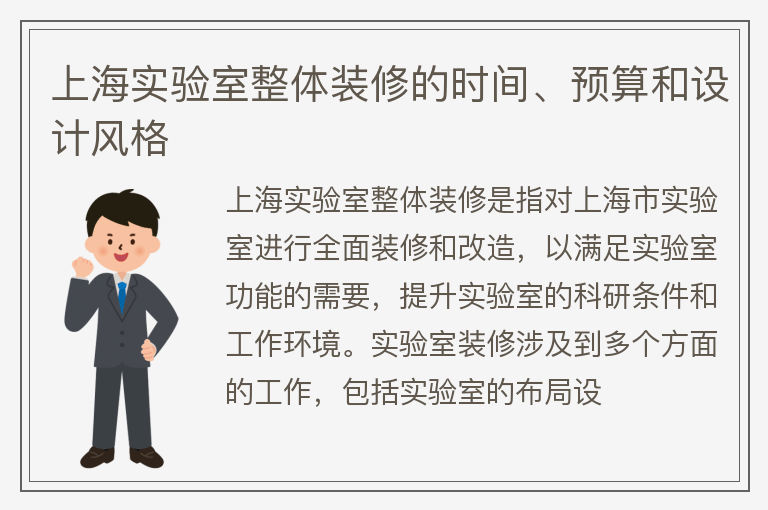 上海实验室整体装修是指对上海市实验室进行全面装修和改造,以满足实验室功能的需要,提升实验室的科研条件和工作环境。实验室装修涉及到多个方面的工作,包括实验室的布局设......【点击详情】
