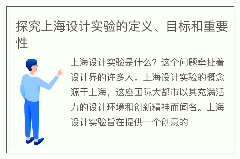上海设计实验是什么?这个问题牵扯着设计界的许多人。上海设计实验的概念源于上海,这座国际大都市以其充满活力的设计环境和创新精神而闻名。上海设计实验旨在提供一个创意的......【点击详情】