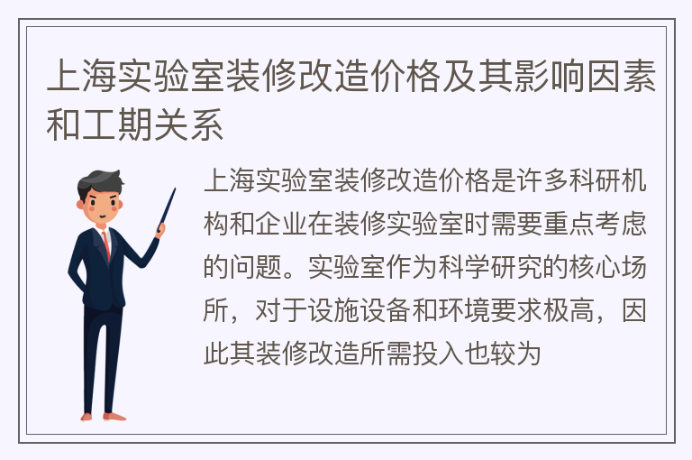 上海实验室装修改造价格是许多科研机构和企业在装修实验室时需要重点考虑的问题。实验室作为科学研究的核心场所,对于设施设备和环境要求极高,因此其装修改造所需投入也较为......【点击详情】