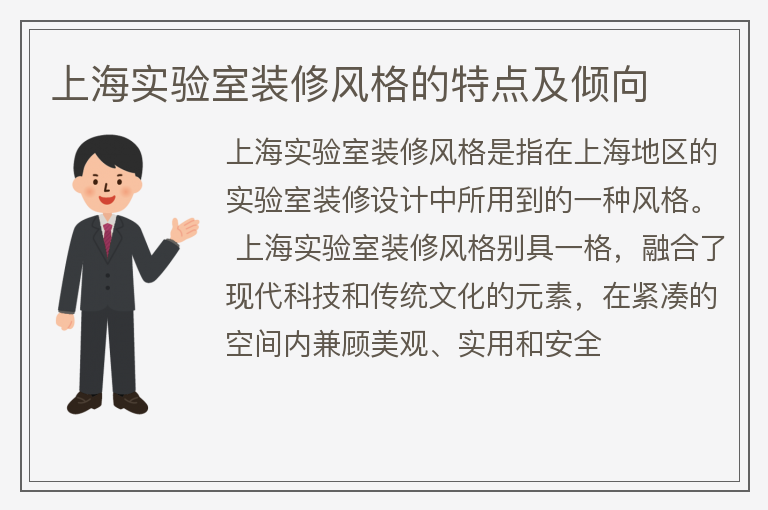 上海实验室装修风格是指在上海地区的实验室装修设计中所用到的一种风格。 上海实验室装修风格别具一格,融合了现代科技和传统文化的元素,在紧凑的空间内兼顾美观、实用和安全......【点击详情】