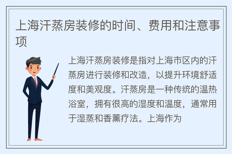 上海汗蒸房装修是指对上海市区内的汗蒸房进行装修和改造,以提升环境舒适度和美观度。汗蒸房是一种传统的温热浴室,拥有很高的湿度和温度,通常用于湿蒸和香薰疗法。上海作为......【点击详情】