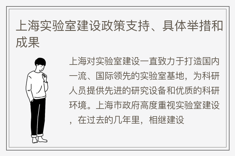 上海对实验室建设一直致力于打造国内一流、国际领先的实验室基地,为科研人员提供先进的研究设备和优质的科研环境。上海市政府高度重视实验室建设,在过去的几年里,相继建设......【点击详情】