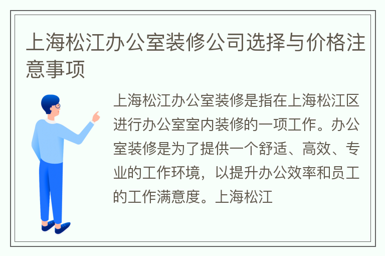 上海松江办公室装修是指在上海松江区进行办公室室内装修的一项工作。办公室装修是为了提供一个舒适、高效、专业的工作环境,以提升办公效率和员工的工作满意度。上海松江......【点击详情】