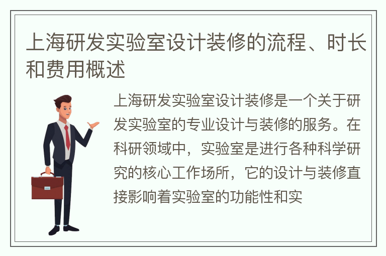 上海研发实验室设计装修是一个关于研发实验室的专业设计与装修的服务。在科研领域中,实验室是进行各种科学研究的核心工作场所,它的设计与装修直接影响着实验室的功能性和实......【点击详情】