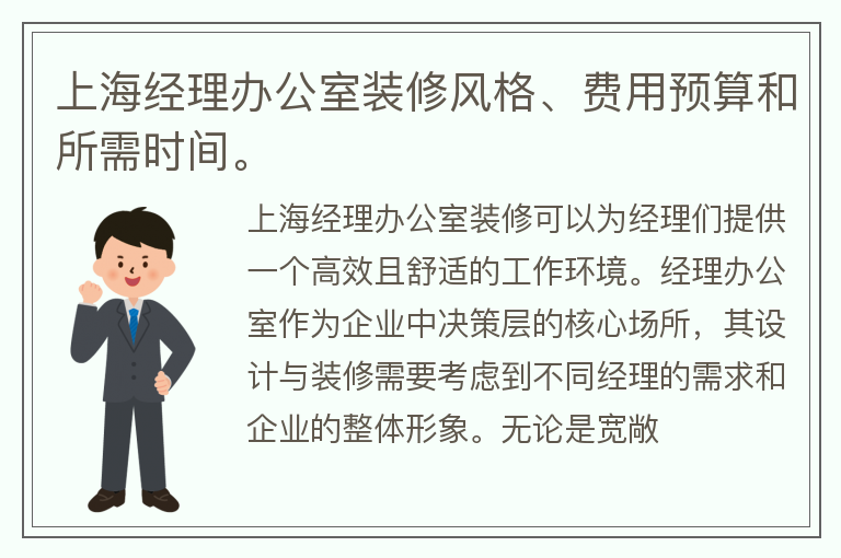 上海经理办公室装修可以为经理们提供一个高效且舒适的工作环境。经理办公室作为企业中决策层的核心场所,其设计与装修需要考虑到不同经理的需求和企业的整体形象。无论是宽敞......【点击详情】